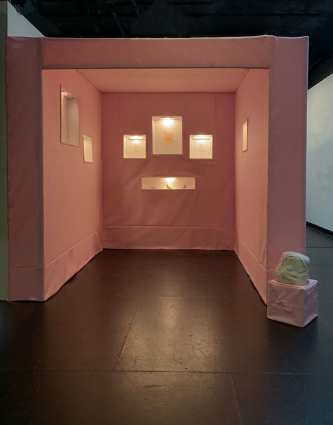 Tony Wei Ling: Yeah. I feel like it's actually hard to coo at your work and say, "Oh, it's so cute," probably because one of the ways you structure it is this intense cleanliness and minimalism to it, which makes it feel like even though it is a domestic space-especially with this installation-there's something very clean and orderly about it. So it's like, "Don't get comfy." Even though it is often about comfort in some way. If this were cluttered or arranged very differently, it'd be easier to see it as cuteness only. Or purely. But your clean and boxy aesthetic counters that.